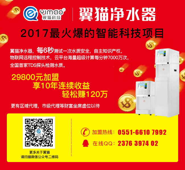 凈水機(jī)招商代理,翼貓科技智能凈水系統(tǒng),用戶(hù)免費(fèi)使用安 裝、免費(fèi)享受更換濾芯、維護(hù)、升級(jí)換代,清洗管道等貼心上門(mén)服務(wù)!翼貓科技以“讓人類(lèi)喝上安 全的每一滴水”為使命,以開(kāi)放者的姿態(tài)快速進(jìn)入市場(chǎng)、顛覆市場(chǎng),讓凈水設(shè)備褪去貴族外衣,真正走進(jìn)千家萬(wàn)戶(hù),為更多消費(fèi)者提供安 全、便捷的飲水體驗(yàn)。