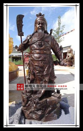 持刀銅關(guān)公像,九龍銅關(guān)公像,青銅關(guān)公像,關(guān)羽最為特殊之處是其倍受中華文化歷代推崇,由于其忠誠(chéng)和武勇的形象,多次被后代帝王褒封,直至“武帝”,故也被稱為關(guān)圣帝君、關(guān)帝君、關(guān)帝等。儒教_奉為五文昌之一,又尊為“文衡圣帝”、“關(guān)西夫子”,道教_奉為“協(xié)天大帝”,“翊漢天尊”。中國(guó)佛 _教_界奉其為護(hù)法神之一,稱為“伽藍(lán)菩薩”。民間由于《三國(guó)演義》等傳統(tǒng)作品的影響,普遍認(rèn)為關(guān)羽與劉備、張飛是結(jié)義兄弟,關(guān)羽排行第二,故又俗稱其為關(guān)公、關(guān)二爺、關(guān)二哥、關(guān)老爺,直至現(xiàn)當(dāng)代的某些社會(huì)群體與場(chǎng)合中,仍然經(jīng)常出現(xiàn)祭拜關(guān)羽的情況。