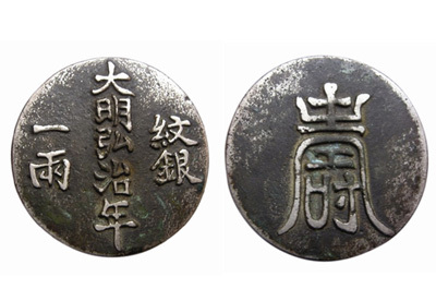 明代一斤等于585.769克,一兩應(yīng)為現(xiàn)在的36.1克,此幣的重量應(yīng)為八錢(qián)六分二厘,所以面文上的“紋銀一兩”是記值,并非記重,即它可以按紋銀一兩的面值在市場(chǎng)流通。