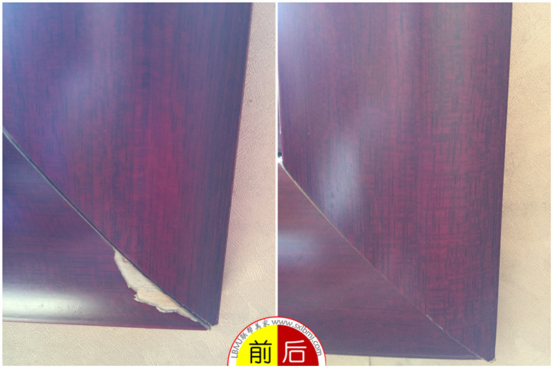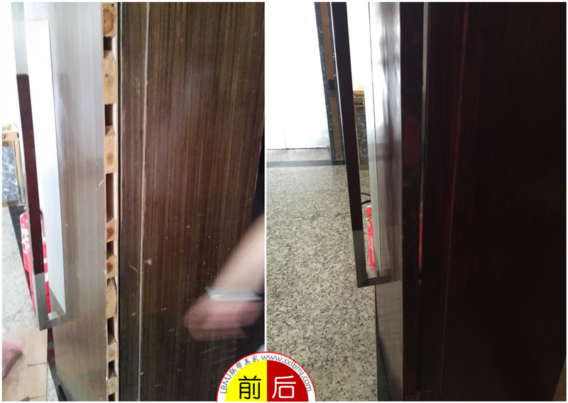 西安 酒店家具維修-戶縣瑛煌商務酒店,安 全門年久嚴重脫漆,門套啞口傷痕累累,所用的劣質木門填充量太少封邊全掉了,露出內部的構造不僅影響美觀,更影響酒店的檔次,太掉范兒了!經過師傅維修及改色后,你看得出來這是舊的家具嗎?節(jié)約了酒店成本,改善了酒店環(huán)境。