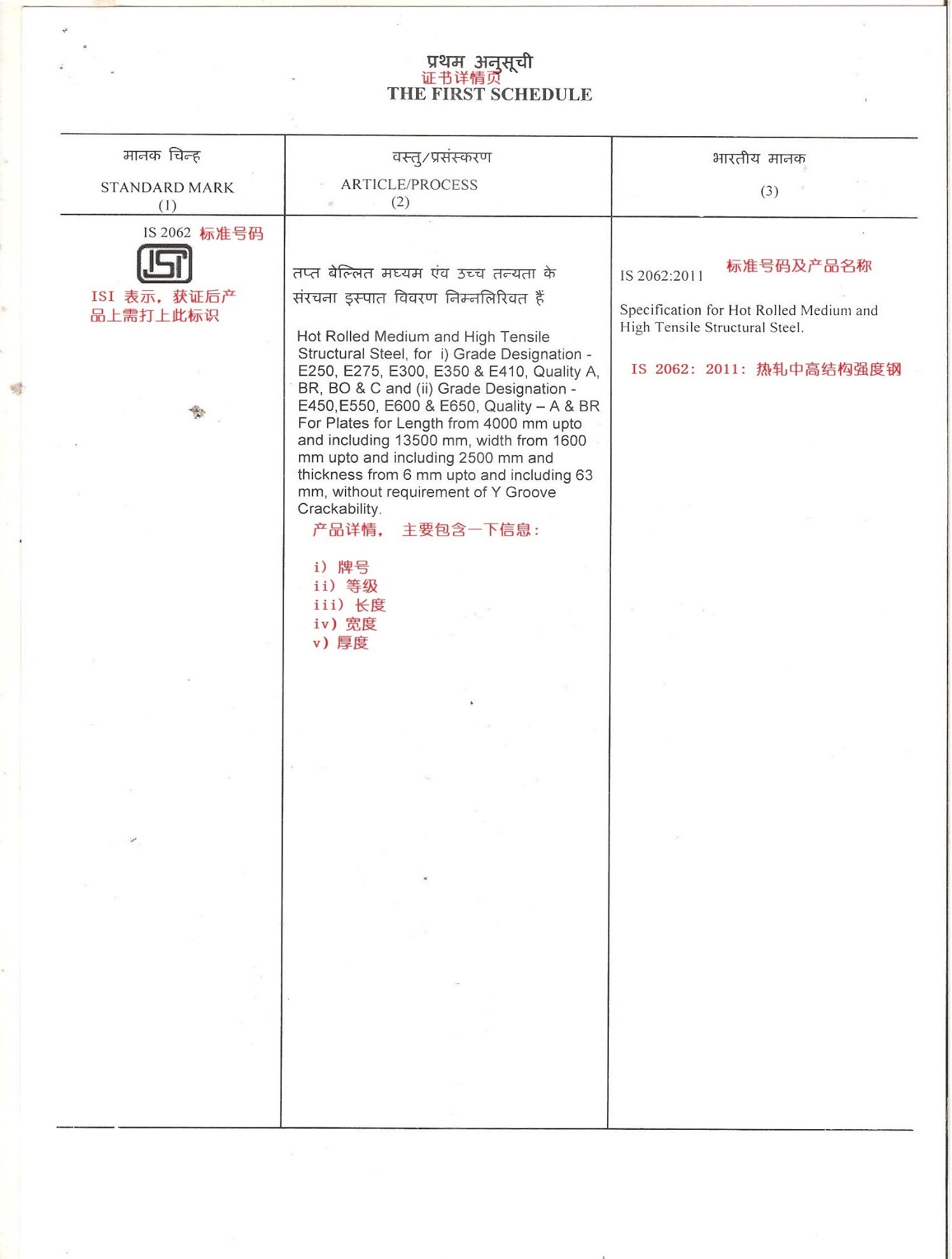 熱軋中厚板/熱軋中高強(qiáng)度結(jié)構(gòu)鋼印度bis 認(rèn)證