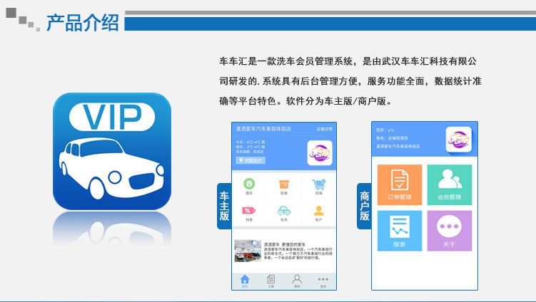 武漢車車匯科技有限公司是一家專業(yè)從事汽車后端服務(wù)市場(chǎng)的移動(dòng)互聯(lián)網(wǎng)企業(yè),旗下研發(fā)的車車匯洗車店會(huì)員管理系統(tǒng)軟件是一款基于云端服務(wù)的洗車店會(huì)員卡管理平臺(tái),通過大數(shù)據(jù)分析和先進(jìn)的云端技術(shù),以終身免費(fèi)服務(wù)為準(zhǔn)則,以洗車店為服務(wù)對(duì)象,集會(huì)員管理、會(huì)員充值、店鋪管理、商品及庫(kù)存管理、交易記錄、收入報(bào)表等功能為一體,創(chuàng)造性的融入營(yíng)銷推廣功能,支持連鎖店鋪同時(shí)管理。顛覆式手機(jī)會(huì)員卡,完美替代傳統(tǒng)刷卡模式,全面實(shí)現(xiàn)消費(fèi)賬單隨時(shí)看。