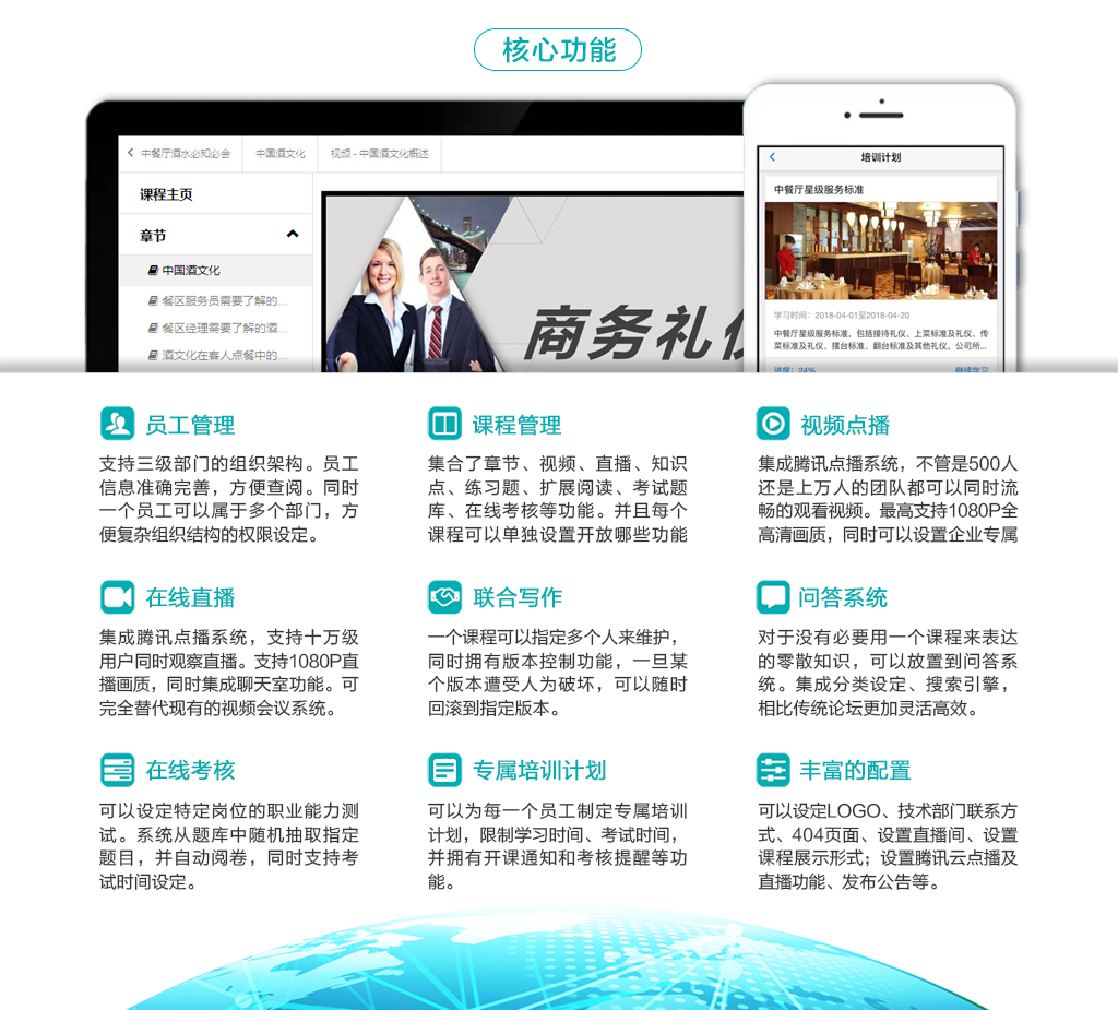 公司培訓(xùn)管理系統(tǒng)網(wǎng)埔e-training是青島同游網(wǎng)絡(luò)技術(shù)有限公司根據(jù)自身多年的教育平臺(tái)開(kāi)發(fā)經(jīng)驗(yàn)以及深入調(diào)研企業(yè)培訓(xùn)需求后自主研發(fā)的一套針對(duì)企業(yè)內(nèi)部培訓(xùn)管理的專(zhuān)用軟件,可以讓企業(yè)將自身知識(shí)及培訓(xùn)資源進(jìn)行整合,形成線(xiàn)上課程(圖文、視頻、直播等形式),員工通過(guò)手機(jī)或電腦即可線(xiàn)上學(xué)習(xí)并完成考核。