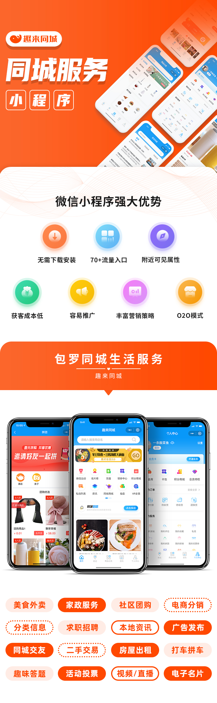 趣來同城是一個(gè)專注于本地吃喝玩樂的精準(zhǔn)社交消費(fèi)平臺(tái),通過公眾號(hào)、小程序、app、社群等流量矩陣,分享本地資訊并為消費(fèi)者提供精準(zhǔn)、豐富、有趣、營銷、優(yōu)惠的本地生活圈,助力同城商家實(shí)現(xiàn)精準(zhǔn)營銷和服務(wù)升級(jí),打造品牌和渠道下沉,并集內(nèi)容創(chuàng)意與服務(wù)創(chuàng)新為一體的本地化服務(wù)平臺(tái)。微信自有功能:公眾號(hào)關(guān)聯(lián)及跳轉(zhuǎn):公眾號(hào)可關(guān)聯(lián)小程序、實(shí)現(xiàn)公眾號(hào)底部菜單及公眾號(hào)文章可跳轉(zhuǎn)到小程序及小程序商品、活動(dòng)等頁面實(shí)現(xiàn)引流。添加到桌面:用戶可在小程序內(nèi)將小程序添加到桌面、添加后用戶可在手機(jī)桌面直接點(diǎn)擊小程序連接進(jìn)入到小程序頁面。平臺(tái)基礎(chǔ)功能:一鍵轉(zhuǎn)發(fā)分享:用戶可將小程序一鍵轉(zhuǎn)發(fā)分享給朋友或分享到群、也可配置自定義分享海報(bào)、將小程序及商品一鍵生成海報(bào)分享。一鍵提交審核:可在后臺(tái)將小程序一鍵提交審核至微信官方進(jìn)行審核。小程序跳轉(zhuǎn):在同一個(gè)公眾號(hào)下面綁定的小程序可實(shí)現(xiàn)兩個(gè)小程序之前的相互跳轉(zhuǎn)功能.支付功能:小程序可接入微信支付、也可購買會(huì)員卡或儲(chǔ)值卡等進(jìn)行支付.權(quán)限設(shè)置:可添加小程序子管理員、限制管理員后臺(tái)及手機(jī)端管理app、實(shí)現(xiàn)多人管理、提高商家運(yùn)營效率.公眾號(hào)信息同步:小程序文章資訊、可一鍵同步公眾號(hào)文章、也可只用網(wǎng)頁鏈接同步網(wǎng)頁文章.首頁diy設(shè)計(jì):版本提供一套固定首頁可以填充使用、也可自定義首頁設(shè)計(jì)、實(shí)現(xiàn)商家個(gè)性化設(shè)計(jì)需求.折疊菜單:手機(jī)顯示范圍有限、底部菜單目前只能顯示5個(gè)、商家可用折疊菜單將更多內(nèi)容展現(xiàn)在首頁顯示.用戶消息訂閱:用戶可在小程端訂閱消息通知,如支付、退款、發(fā)貨等,訂閱后用戶觸發(fā)相應(yīng)條件,微信端會(huì)受到服務(wù)通知(需配置消息模板).用戶管理:用戶資料導(dǎo)出、每日新增用戶顯示、設(shè)置會(huì)員等級(jí)、可設(shè)置會(huì)員等級(jí)成立條件.在線客服:用戶在小程序端可與商家在線溝通、商家通過企商平臺(tái)(手機(jī)端管理app)或配置微信/電腦端客服等與用戶進(jìn)行溝通回復(fù).自定義表單:商家可配置留言表單、收集用戶信息或?qū)τ脩暨M(jìn)行問卷調(diào)差,通過自定義表單實(shí)現(xiàn)商家信息征集.數(shù)據(jù)統(tǒng)計(jì):小程序支持(阿拉丁)數(shù)據(jù)統(tǒng)計(jì)、可對(duì)用戶信息如:用戶留存、平均訪問時(shí)長、訪問人數(shù)、場(chǎng)景值分析、頁面分享等進(jìn)行統(tǒng)計(jì).商家入駐:支持商家入駐、可對(duì)商家進(jìn)行分類設(shè)置、也可設(shè)置入駐時(shí)長、店鋪收益提成等進(jìn)行設(shè)置、實(shí)現(xiàn)商家交易多渠道收益.論壇:可設(shè)置付費(fèi)發(fā)帖、付費(fèi)置頂、帖子分類、帖子舉報(bào)管理等。也可設(shè)置帖子隱私,帖子是否允許顯示電話等.手機(jī)端管理app:平臺(tái)有手機(jī)端管理app、可設(shè)置多賬號(hào)不同權(quán)限管理員登錄、對(duì)商品、活動(dòng)、用戶、訂單、收益等實(shí)現(xiàn).訂單打印:云打印目前支持飛鵝牌打印機(jī)自動(dòng)打印、也可以用手機(jī)端管理app實(shí)現(xiàn)藍(lán)牙打印等.