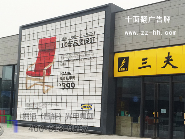 機(jī)_械翻頁(yè)十面翻為洪海(智能)光電集團(tuán)獨(dú)家研制,可以像翻書一樣翻轉(zhuǎn)顯示十副畫面的廣_告_機(jī)_,以一變十的廣_告_效應(yīng),充分利用現(xiàn)有黃金廣_告_位,給您帶來(lái)更大的廣_告_收益,幾十種類似多米諾骨牌的翻轉(zhuǎn)方式,以巨大的視覺(jué)沖擊,牢牢吸引人的目光!