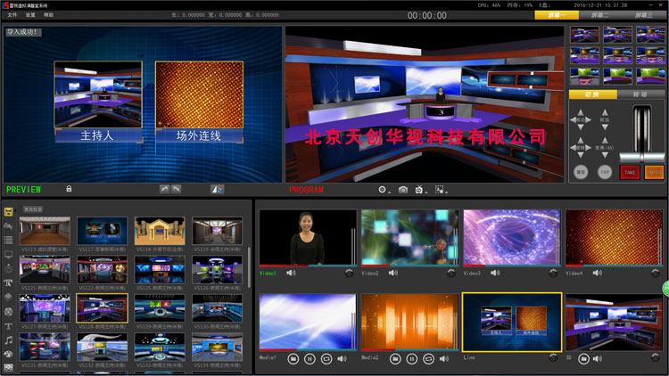 無軌虛擬演播室系統(tǒng)可支持一路視頻信號輸入,并由系統(tǒng)模擬出12個(gè)全景攝像機(jī)位效果。因此,用戶只需一臺攝像機(jī)就能達(dá)到三訊道演播室效果。在3d場景中能提供12個(gè)特寫和全景機(jī)位。虛擬攝像機(jī)移動或演員移動時(shí),不需要使用傳感器做任何測量。在真實(shí)攝像機(jī)本身保持不動的情況下,通過制作3d場景動畫,改變場景中各個(gè)景物的相對角度和位置,便可簡單快捷地完成場景定位。高品質(zhì)三維虛擬場景實(shí)時(shí)渲染系統(tǒng)