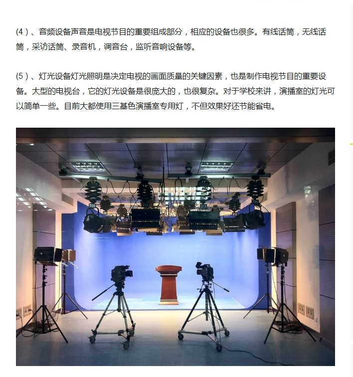 訪談直播演播室搭建設(shè)備組成以成熟的視頻技術(shù)進(jìn)行合理搭配,支持?jǐn)?shù)據(jù)、語音、視像等多媒體應(yīng)用,用基于數(shù)字視頻的技術(shù)替代傳統(tǒng)的模擬視頻的技術(shù)。標(biāo)準(zhǔn)化和開放性視頻標(biāo)準(zhǔn)應(yīng)遵循國際化標(biāo)準(zhǔn),使用國內(nèi)標(biāo)準(zhǔn)的pal制,演播室按照標(biāo)準(zhǔn)建造應(yīng)用新的布線方法,根據(jù)現(xiàn)有的設(shè)備進(jìn)行合理配套,使得新老設(shè)備均能正常使用 ,為了今后的發(fā)展事先預(yù)留出應(yīng)用端口及軟硬件的升級換代,提供開放性的解決方案。