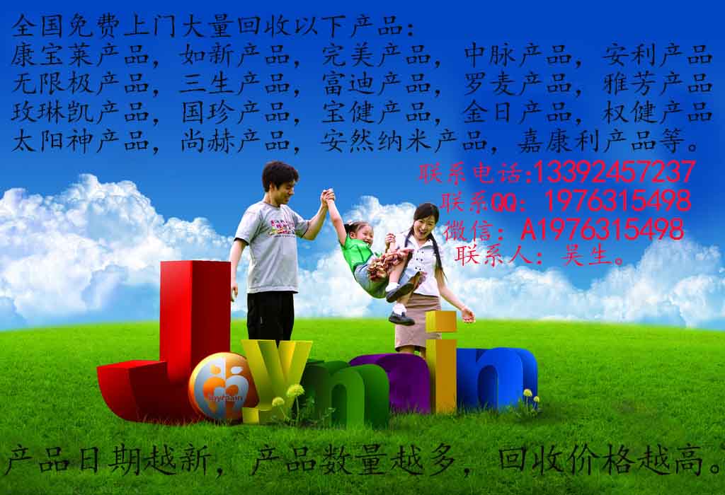 哪兒回收中脈產(chǎn)品,哪兒收購康寶萊產(chǎn)品,哪兒回收國珍產(chǎn)品。歡迎來電咨詢吳生133-924-572-37咨詢qq 197-631-549-8微信號(hào)a19-763-154-98。中脈凈水機(jī)回收價(jià)格是多少?幾錢收購中脈凈化器?有沒有人需要回收處理中脈床上用品的。中脈產(chǎn)品回收處理哪里更有優(yōu)勢(shì)。大量收購康寶萊奶昔,回收康寶萊混合飲料。回收康寶萊本草膳食纖維粉 ,康寶萊奈沃科粉 ,康寶萊營養(yǎng)系列產(chǎn)品;厥諊湎盗挟a(chǎn)品。回收國珍牌松花粉 。常年全國大量高價(jià)收購如新產(chǎn)品,無限極產(chǎn)品,康寶萊產(chǎn)品,完美產(chǎn)品,安 利產(chǎn)品,中脈產(chǎn)品,三生產(chǎn)品,玫琳凱產(chǎn)品,天獅產(chǎn)品,羅麥 產(chǎn)品,優(yōu)莎娜產(chǎn)品,富迪產(chǎn)品,太陽神產(chǎn)品,嘉康利產(chǎn)品,雅芳產(chǎn)品,國珍產(chǎn)品,寶健產(chǎn)品,金日產(chǎn)品,尚赫產(chǎn)品,權(quán)健產(chǎn)品,安 然納米產(chǎn)品等