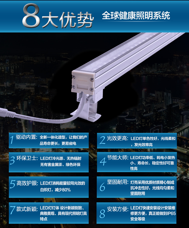本公司主要生產(chǎn)的led戶外燈具產(chǎn)品有:led線條燈、led護欄管、led洗墻燈、led投光燈、led地埋燈、led水底燈、led壁燈、led點光源、led瓦楞燈、led太陽能路燈、led隧道燈、led庭院燈、led景觀燈、led節(jié)日燈等,廣泛應(yīng)用于市政工程、樓體大廈、橋梁、園林景觀、游樂場、開發(fā)區(qū)、廣場、別墅區(qū)、公路、酒店、高檔會所等場所。公司一直堅持走高品質(zhì)、精品產(chǎn)品的路線,加強質(zhì)量管理,嚴格按照iso9001/2000版質(zhì)量體系,同時,我們也積極開展產(chǎn)品的安 全認真工作,致力于產(chǎn)品的國際化,與國際認證產(chǎn)品并軌,被評為“世界知名品牌”“中國著名品牌”“中國市政工程推薦品牌”“中國馳名品牌”“中國名優(yōu)產(chǎn)品”等。