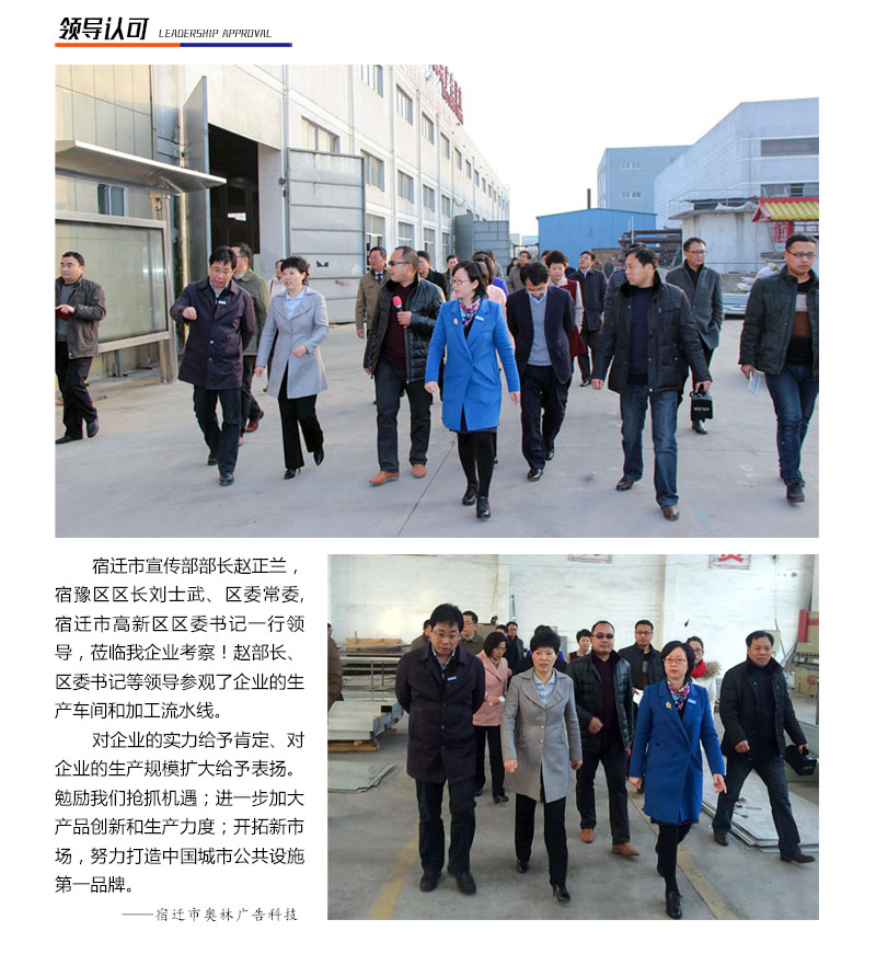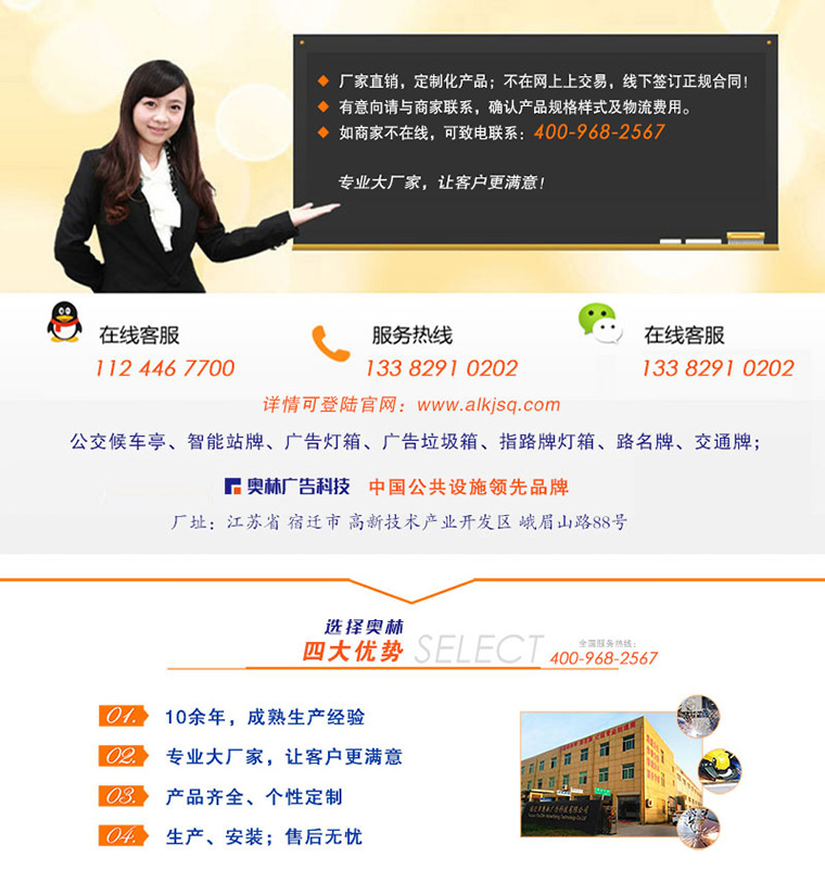 宿遷市奧林廣告科技有限公司,始創(chuàng)于2016年,專業(yè)從事城市公共設(shè)施的研發(fā)和制造,公司本著“以實(shí)業(yè)為基礎(chǔ),以科技為先導(dǎo),以優(yōu)質(zhì)產(chǎn)品回饋客戶”為經(jīng)營理念。設(shè)計(jì)、生產(chǎn)、安裝,一站式服務(wù),產(chǎn)品形成以“候車亭、電子站牌、太陽能燈箱、宣傳欄、路名牌”為核心,等涵蓋戶外所有公共設(shè)施產(chǎn)品的產(chǎn)品體系。