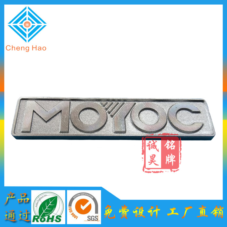 1凸字工藝:我們做壓鑄鋁標牌之前先要開一套五金壓鑄模具和菲邊模具,模具上面雕刻字體和logo,雕刻字體和logo凹下在模具表面的,將模具加熱處理好之后,就可以用于制作壓鑄鋁標牌,將鋁板原材料油在模具表面通過油壓機擠壓成形,凸字工藝就是字體和logo凸起來,字體和logo表面雕刻拉絲,批花,這樣可以讓你的標牌會更加有立體感,目前國內(nèi)國外很多國際名牌都是使用黑底銀字工藝這一種做法,黑底可分為(噴漆黑底,亮光黑底,啞光黑底,氧化黑底)標牌底部顏色我們可以供你選擇,比如紅,橙,黃,綠,藍,青,紫,白,只要你想要做的顏色,我們就有辦法調(diào)出來,只要你提供標準國際潘通色號給我們。