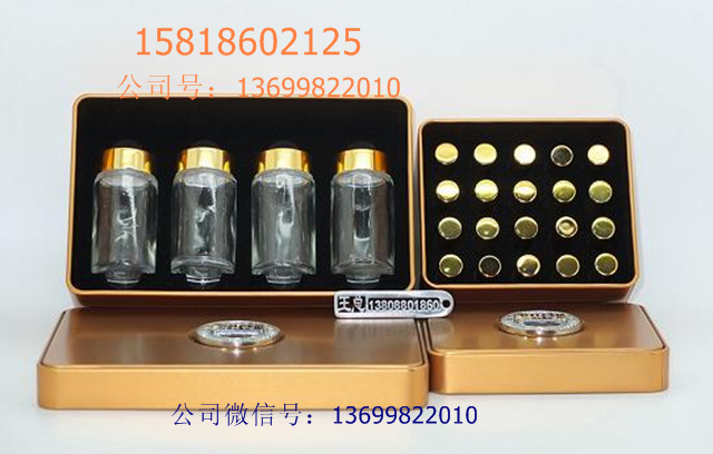 5x極草包裝鐵盒,極草粉 劑 與鍍金帽玻璃小管配合金屬標(biāo)識(shí)牌構(gòu)造而成,鐵盒是金色,配合玻璃瓶與內(nèi)襯,金屬標(biāo)識(shí)牌構(gòu)造而成,可容納12支裝、20支小管組成的套裝,鐵盒還可以搭配其他套裝盒等。