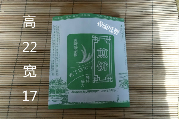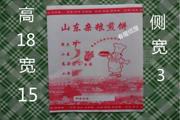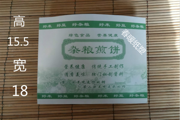 該煎餅果子紙袋自投入市場以來,因以環(huán)保衛(wèi)生、設(shè)計精美、售價低廉、防油防潮、易于攜帶等特點深受廣大使用者的喜愛,迅速占領(lǐng)了煎餅果子包裝市場。 同時,公司為滿足不同客戶需要,開發(fā)出對折和中封兩種不同工藝的煎餅果子袋,前者為袋子開口處不齊,以便于使用者很容易打開袋子,方便把東西放進(jìn)去。后者其特點為結(jié)實牢固,而且可以做出墻子,具有強(qiáng)烈的立體感。在印刷方面,均采用水墨印刷,已達(dá)到真正地環(huán)保效果。