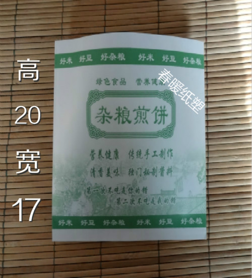 公司本著從市場實際出發(fā),備有大量通用版的現(xiàn)貨,以備客戶急用,還可按客戶的要求來設(shè)計圖案、商標(biāo)、公司logo、以及地址、電話、廣告 語、產(chǎn)品介紹等不同的煎餅果子紙袋