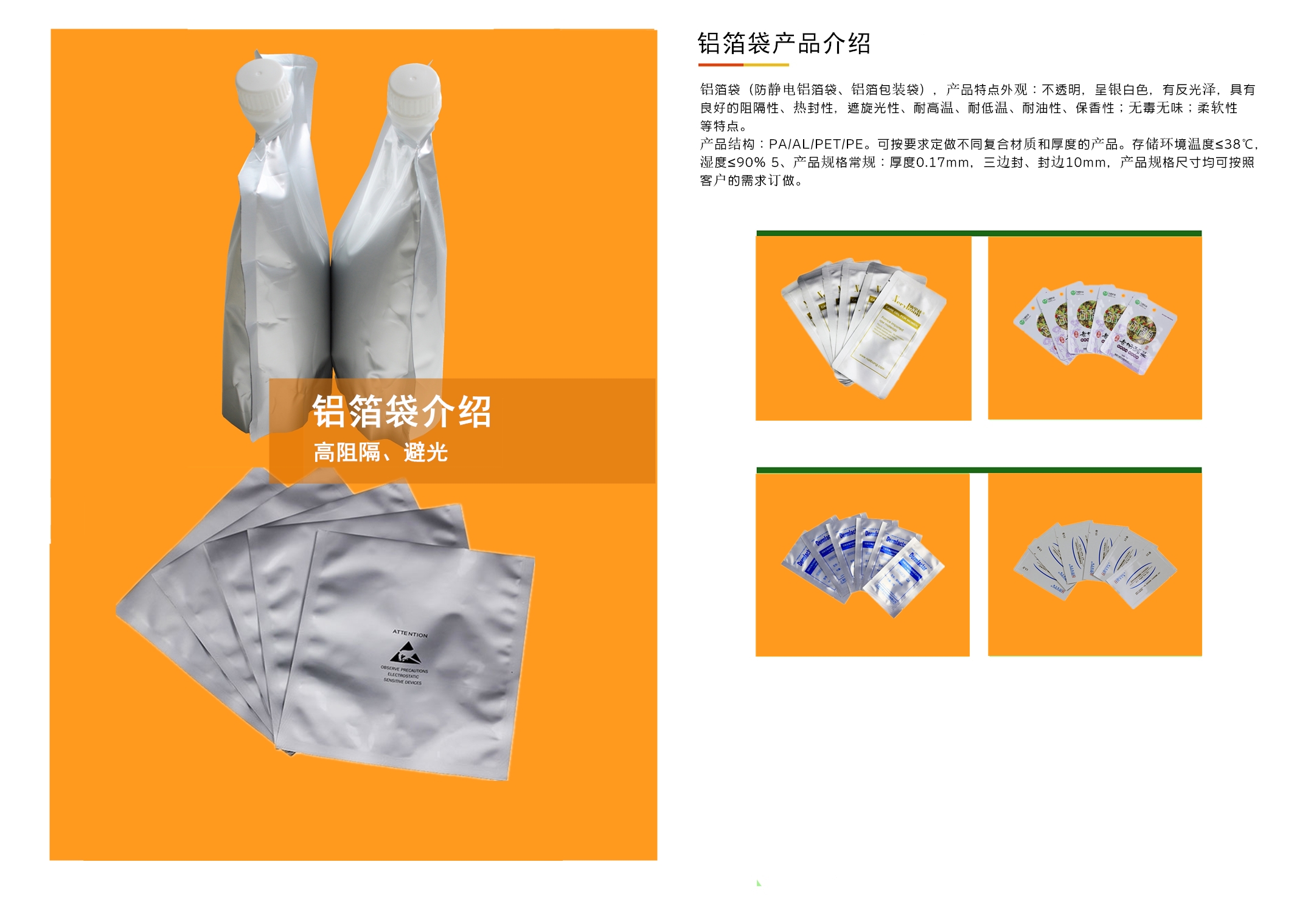 主營:鋁箔袋、真空袋、屏蔽袋、尼龍袋、鍍鋁袋、防潮鋁箔袋、防靜電屏蔽袋、尼龍真空袋、真空包裝袋、復合屏蔽袋、復合卷膜、pe膜、直線易撕膜、防霧膜、多色印刷袋等各類軟包裝材料。