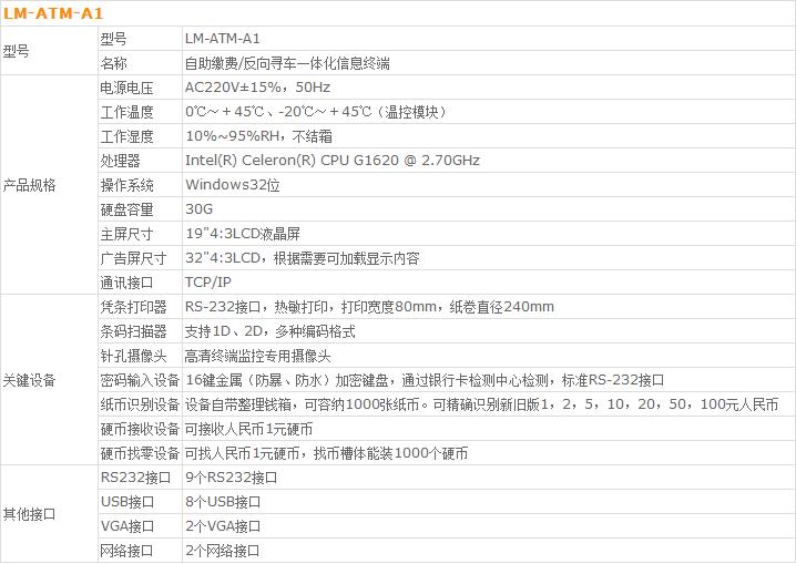 lm-atm-a1自助繳費(fèi)機(jī)/反向?qū)ぼ囈惑w化信息終端專門針對(duì)金融行業(yè)、數(shù)字化城市、醫(yī) 療行業(yè)開發(fā)的非現(xiàn)金自助服務(wù)終端,通過觸摸方式,以友好的人機(jī)交互界面為客戶提供服務(wù),該類產(chǎn)品外型美觀大方,具有國際級(jí)外觀專利,工藝考究,可擴(kuò)展性強(qiáng),集安 全性、可靠性、實(shí)用性為一身。