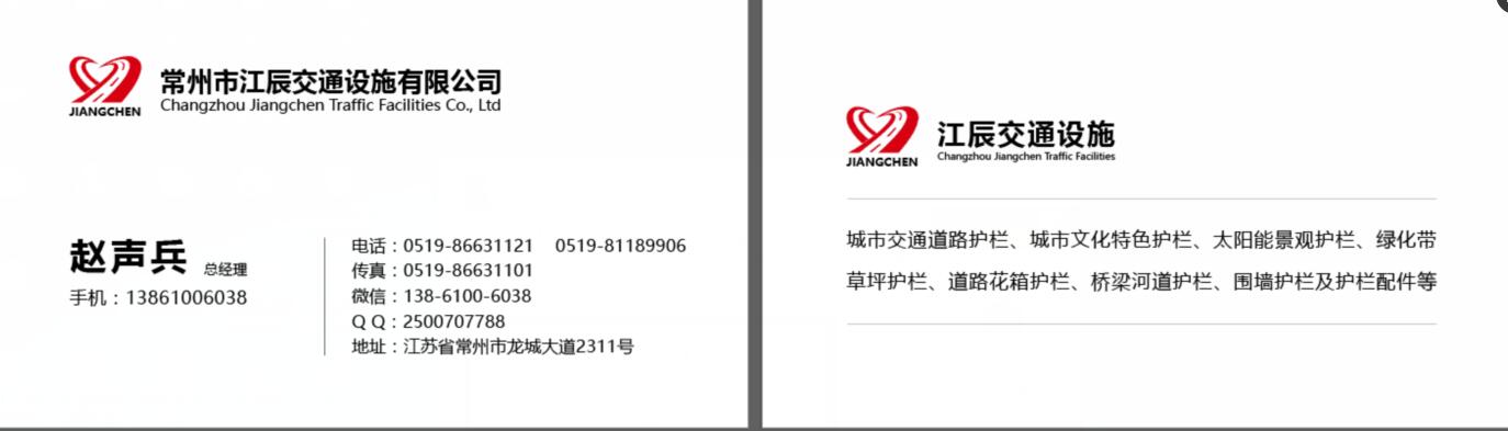 江辰公司其生產(chǎn)的金屬護(hù)欄系列產(chǎn)品廣泛應(yīng)用于:道路、圍墻、別墅、草坪、河道、鐵路、機(jī)場、碼頭等各種領(lǐng)域。產(chǎn)品美觀大方,采用四層表面處理技術(shù)更使產(chǎn)品具有耐腐蝕、抗老化、耐酸 堿 、不褪色、表面平整、光亮、手感好等特點(diǎn)。產(chǎn)品暢銷全國。