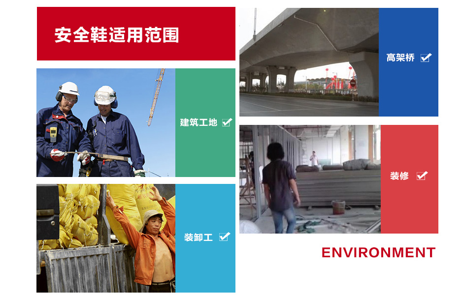 對于建筑工地、高架橋、裝修、裝卸工這些工作場景,勞動安 全事故經(jīng)常發(fā)生的事情就是雙腳被砸傷、刺傷,甚至雙腳殘廢,所以必須穿著防護用品防砸防刺穿安 全鞋。像建筑工人他們要穿的是防砸安 全鞋、防刺穿安 全鞋,因為要面對施工場地復雜的作業(yè)環(huán)境,比如地上有鐵釘、高空有墜物等等,而高架橋、裝修、裝修工他們在作業(yè)時同樣會遇到如上情形,只有穿著防砸防穿刺安 全鞋,才能更加安 全工作!