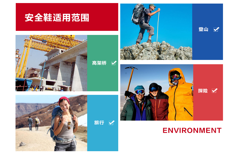 隨著人們對(duì)戶外運(yùn)動(dòng)的熱愛,越來(lái)越多的人會(huì)選擇登山、旅行、探險(xiǎn)這些戶外運(yùn)動(dòng),但是人們的安 全意識(shí)淡薄,面臨戶外復(fù)雜地形及環(huán)境時(shí),因沒(méi)有穿著必備的防護(hù)用品,如防砸安 全鞋、防刺穿安 全鞋等,造成悲劇的發(fā)生。同樣對(duì)于高架橋這個(gè)行業(yè)作業(yè)的人員來(lái)說(shuō),也是需要工人們做好必備的安 全防護(hù)措施,穿著安 全鞋是少不了的。