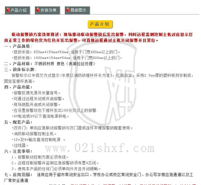使用方便,不易省壞且電池使用周期長(zhǎng)。報(bào)警標(biāo)示以中英文方式顯示(長(zhǎng)度以消防鎖推桿桿長(zhǎng)為準(zhǔn)),紅底白字,采用2.5mm厚的塑料板刻字制成,固定至推桿表面。