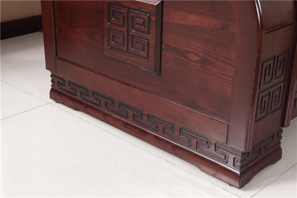 造型莊重,內(nèi)斂不失貴族之氣,滿滿的實(shí)木感,將黃菠蘿木質(zhì)緊密、花紋美觀體現(xiàn)的淋漓盡致。寬大厚實(shí)的扶手,配合傳統(tǒng)的回紋圖案,映射出儒家天圓地方中庸之道,渾然大氣,與生俱來(lái),后背條紋設(shè)計(jì)古典雅氣。沙發(fā)抽屜扣手采用祥云設(shè)計(jì),配合周邊線條,寓意富貴無(wú)邊,清晰的紋理,高雅的紅色色調(diào),體現(xiàn)出尊貴之范