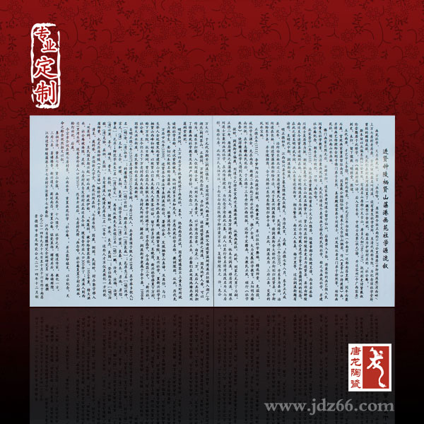 景德鎮(zhèn)唐龍?zhí)沾删妥溆谶@座城市的中央,公司集陶瓷設計、制作與銷售為一體,是一家具有一定實力與規(guī)模的陶瓷有限公司。我公司生產陶瓷瓷板畫,陶瓷裝飾畫,大型裝飾壁畫、瓷像肖像畫、瓷板畫屏風、梅蘭竹菊瓷板畫、仿郎世寧瓷板畫、景德鎮(zhèn)瓷器瓷板畫等多種款式與畫面等一系列瓷板藝術品。景德鎮(zhèn)陶瓷瓷板畫經過1300度的高溫燒制后,畫面永不退色,不怕風吹日曬,耐火燒刀刮,具有很強保存與收藏的價值。景德鎮(zhèn)陶瓷瓷板畫工藝有手繪與貼花兩種,手繪的陶瓷瓷板畫是人工在瓷板上一筆一筆畫出來,然后再上色上釉再經過高溫燒制出來的;貼花的陶瓷瓷板畫是畫面經過電腦設計打印,然后把畫面印制到花紙上,在經過高溫燒制出來。不論是貼花還是手繪的陶瓷瓷板畫,擺在家里,酒店,賓館,公司等公共場所,都是一道很亮麗的風景線。,青花畫面的素 雅簡單、高雅大方;粉 彩畫面的色彩艷麗,畫面形象生動,各有各的特色。