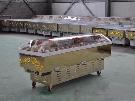 冰 棺廠家白事新款,本公司生產(chǎn)的冰 棺(水晶棺)的外寬70厘米,總長2.05米,總高1米,棺蓋為pc耐力板,耐高溫耐低溫不怕暴曬,不銹鋼箱體,壓縮機為銅管的,壽命長.全自動電腦控溫,技術(shù)先進,大功率2臺壓縮機的,帶mp3哀樂播放,棺內(nèi)鮮花開放,彩燈環(huán)繞更顯豪華大方,重量為80公斤左右,冰 棺內(nèi)底部是不銹鋼板的,易清洗,耐腐蝕,具有制冷快、使用壽命長,節(jié)能和環(huán)保等特點,適用于殯儀館,個人殯儀出租等