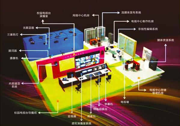 校園電視臺主要由演播室、視頻、音頻、導(dǎo)播切換虛擬系統(tǒng)、錄制編輯系統(tǒng)和網(wǎng)絡(luò)流發(fā)布平臺、媒體資源管理系統(tǒng)幾大部分組成。校園級別的電視臺一般來說屬于民用級別,各個學(xué)校根據(jù)財力和需求的不同所需設(shè)備不盡相同。