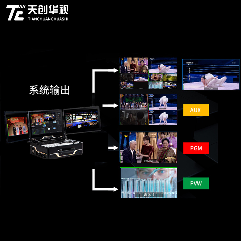 現(xiàn)場(chǎng)活動(dòng)網(wǎng)絡(luò)直播融媒體多功能一體機(jī)集成字幕機(jī)、特效編輯、本機(jī)錄制、虛擬摳像、虛擬切換臺(tái)、虛擬調(diào)音臺(tái)、ndi技術(shù)、信號(hào)轉(zhuǎn)換、視頻編單播出、畫中畫、網(wǎng)絡(luò)直播多功能于一體。