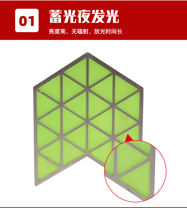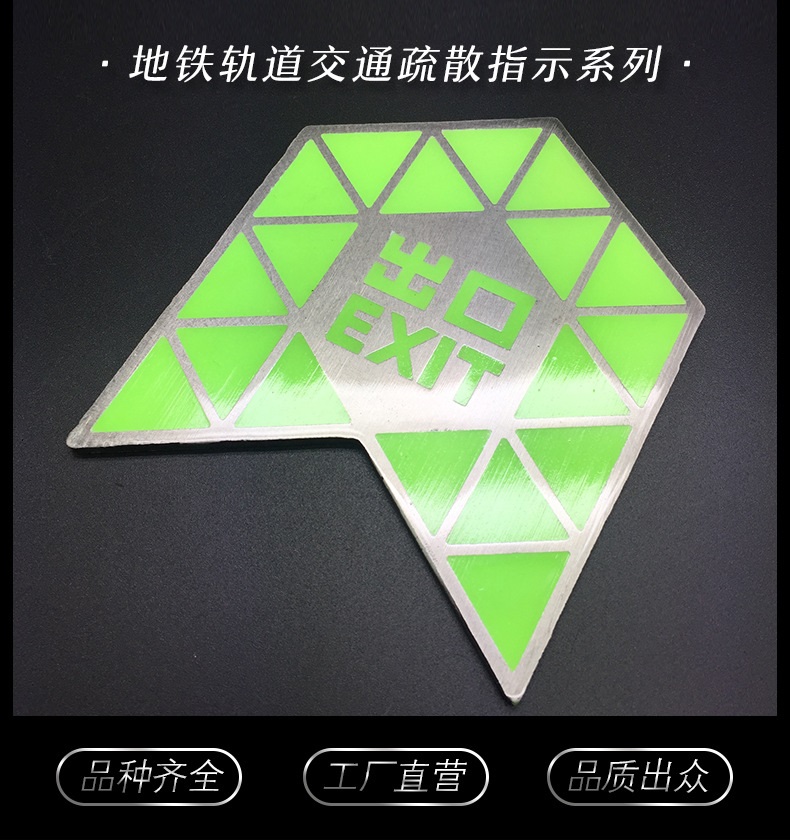 2、304不銹鋼凹刻,圖文下沉1-1.2mm深度,凹面內(nèi)填黃綠色或者亮綠色蓄光自發(fā)光材料,表面與不銹鋼表面平齊。