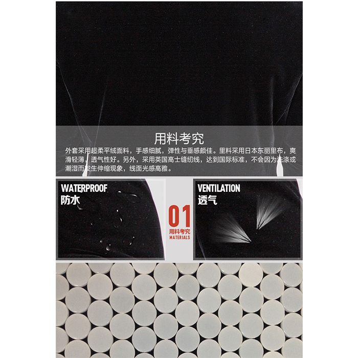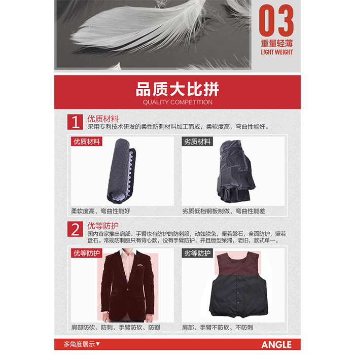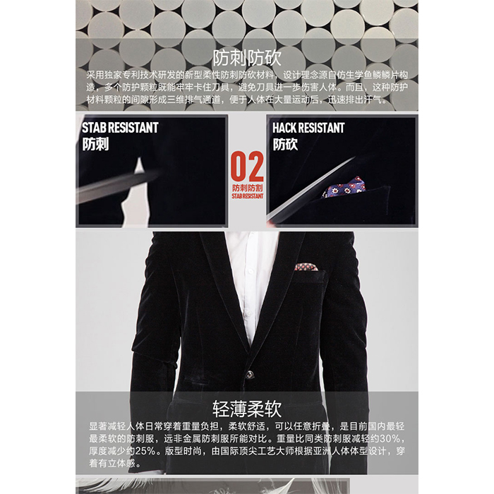 西服款柔性防護(hù)服內(nèi)芯采用獨(dú)家專利技術(shù)研發(fā)的新型柔性防護(hù)復(fù)合材料精心做工而成。外套根據(jù)中國(guó)男人的身形而量身打造,設(shè)計(jì)新穎,工藝獨(dú)特,立體感強(qiáng)。防護(hù)內(nèi)芯既有優(yōu)良的防護(hù)性能,又有柔軟舒適、靈活透氣、隱蔽性高等諸多優(yōu)點(diǎn)。