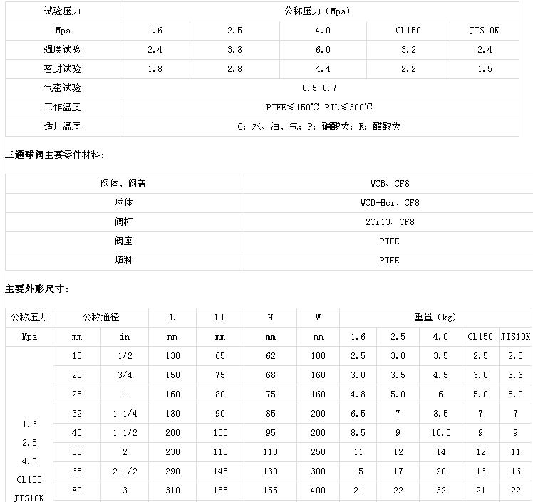 三通球閥可分為l形和t形,l形(q44f)三通球閥用于介質(zhì)流向的切換,能使相互垂直的兩個(gè)通道連接;t形(q45f)三通球閥用于介質(zhì)分流、合流及流向切換。t形三通可以使三個(gè)通道相互連通或使其中的兩個(gè)通道連通。三通球閥一般采用兩閥座結(jié)構(gòu),亦可根據(jù)用戶要求采用四閥座結(jié)構(gòu)。性能參數(shù):試驗(yàn)壓力公稱壓力(mpa)mpa1.62.54.0cl150jis10k強(qiáng)度試驗(yàn)2.43.86.03.22.4密封試驗(yàn)1.82.84.42.21.5氣密試驗(yàn)0.5-0.7工作溫度ptfe≤150℃ ptl≤300℃適用溫度c:水、油、氣;p:硝酸 類;r:醋酸 類三通球閥主要零件材料:
