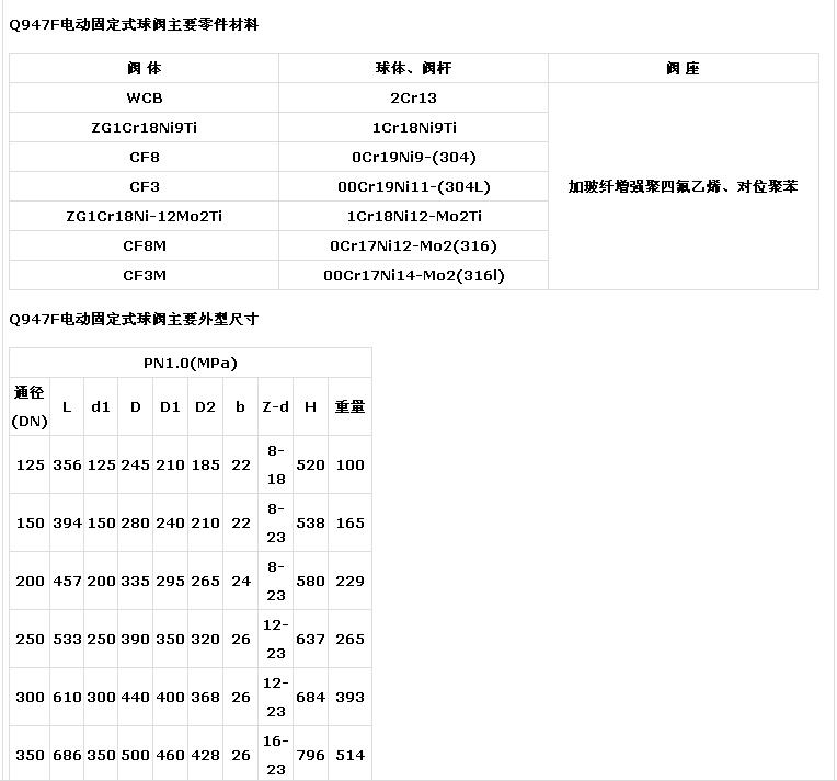 產(chǎn)品名稱:電動固定式球閥產(chǎn)品型號:q947f產(chǎn)品口徑:dn15-250產(chǎn)品壓力:0.6~6.4mpa產(chǎn)品材質(zhì):鑄鋼、不銹鋼、合金鋼等產(chǎn)品簡介:制造標準:中國gb、機械部jb、化工標準hg、美標api、ansi、德標din、日本jis、jpi、英標bs生產(chǎn)。閥體材質(zhì):銅、鑄鐵、鑄鋼、碳鋼、wcb、wc6、wc9、20#、25#、鍛鋼、a105、f11、f22、不銹鋼、304、304l、316、316l、鉻鉬鋼、低溫鋼、鈦合金鋼等。工作壓力1.0mpa-50.0mpa。工作溫度:-196℃-650℃。連接方式:內(nèi)螺紋、外螺紋、法蘭、焊接、對焊、承插焊、卡套、卡箍。驅(qū)動方式:手動、氣動、液動、電動。上;菹拈y門有限公司擁有全球最頂尖的生產(chǎn)設(shè)備和技術(shù)工程師,有能力按照各國標準以及各種行業(yè)標準生產(chǎn)制造優(yōu)質(zhì)閥門。聯(lián)系電話:15901687301 產(chǎn)品詳情q947f電動固定式球閥主要性能規(guī)范型 號試驗壓力ps(mpa)工作溫度(℃)適用介質(zhì)殼 體密封(液)密封(氣)q947f-101.5pn1.1pn0.6 mpa-29-200(加玻纖增強聚四氟乙烯)、-29-300(對位聚苯 )水、蒸汽、油品等q947f-16硝酸 等腐蝕性介質(zhì)強氧化性介質(zhì)q947f-25q947f-64醋酸 等腐蝕性介質(zhì)q947f-160尿素 等腐蝕性介質(zhì)q947f電動固定式球閥主要零件材料