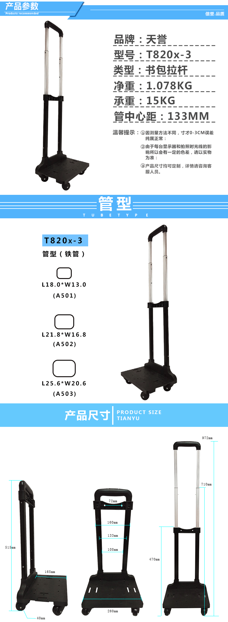 東莞天譽(yù)生產(chǎn)的這款t820-x萬(wàn)向輪書包拉桿把手采用優(yōu)質(zhì)abs工程塑料;管材采用0.6mm厚度管,更結(jié)實(shí),更耐用;一鍵控制拉桿收縮;底盤加長(zhǎng),承重力更強(qiáng)?捎糜跁瓧U,簡(jiǎn)單實(shí)用的外觀,適合每個(gè)年齡階段使用,在出行、購(gòu)物、買菜、拉貨時(shí)都可以使用。折疊后體積小,方便隨身攜帶,不使用可以放到車后備箱,以備不時(shí)之需。