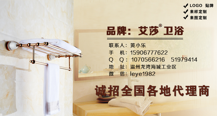 艾莎衛(wèi)浴 開發(fā)、生產(chǎn)及銷售:衛(wèi)浴掛件,五金掛件,毛巾架,置物架,紙巾架,衣鉤,馬桶刷,毛巾環(huán),毛巾?xiàng)U,皂液器,單杯單碟,雙杯,紙巾盒,多功能刀具架,晾衣繩,龍頭,淋雨花灑,等衛(wèi)浴相關(guān)產(chǎn)品;專業(yè)打造太空鋁、不銹鋼、全銅廚衛(wèi)五金掛件.《《網(wǎng)上只發(fā)布部分產(chǎn)品也無法時(shí)時(shí)更新,如果需要了解更多新款產(chǎn)品請電聯(lián)或者qq、微信了解。如果外貿(mào),酒店,工程采購需要老款物廉價(jià)美產(chǎn)品,只要你有量停產(chǎn)業(yè)有磨具一樣可以接單,歡迎來圖、來樣定制。》》