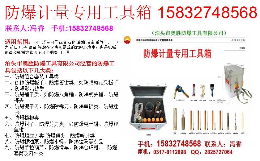 詳細(xì)地址:河北省滄州泊頭市經(jīng)濟(jì)技術(shù)開發(fā)區(qū) 泊頭市奧勝防爆工具有限公司,專業(yè)生產(chǎn),專門針對(duì)石油管道,化工管道,液化氣管道,搶險(xiǎn)維護(hù),維修堵漏設(shè)計(jì)生產(chǎn)的防爆組合工具:山東jlzy19/28/36/47/50防爆計(jì)量組合工具深受廣大客戶好評(píng)。公司專業(yè)供應(yīng)防爆工具,防爆組合工具箱:山東jlzy19/28/36/47/50防爆計(jì)量組合工具,防爆防靜電工具,防爆呆扳手,防爆梅花扳手,防爆活扳手,防爆管鉗,防爆鉗,防爆螺絲刀,防爆八角錘,防爆錘,防爆開口扳手,防爆敲擊扳手,防爆閥門扳手,防爆絲刷,防爆刀,防爆鏟等各種防爆工具,專用工具,組合工具箱等。