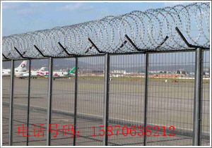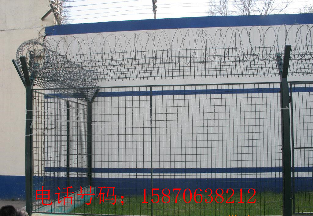 監(jiān)獄防護(hù)網(wǎng)又稱監(jiān)獄護(hù)欄網(wǎng)或監(jiān)獄隔離柵,主要是采用高強(qiáng)度的刀片刺網(wǎng)與普通防護(hù)網(wǎng)的結(jié)合,由v型支架立拄,加強(qiáng)型焊接片網(wǎng),安 全防盜連接件和刀片刺網(wǎng)組成.刀片刺網(wǎng)是一種新型防護(hù)網(wǎng),由銳利尖角鍍鋅鋼板或不銹鋼薄板做刀片,鋼絲做芯線組合而成的防護(hù)器材.