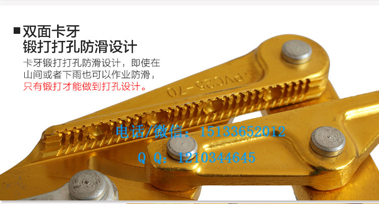 鋁合金絕緣導(dǎo)線卡線器:用于絕緣導(dǎo)線的收線或弧垂調(diào)整。本體由鋁合金制造,自重輕,外型美觀。鉗口為特殊處理,帶倒網(wǎng)紋,不論冬夏都能牢牢抓住線纜,不脫落,不傷導(dǎo)線外護(hù)套鋁夾頭緊固器 鋁卡頭型號適用導(dǎo)線額定負(fù)荷