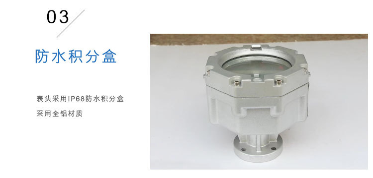 1、鋁殼積分表頭、帶防水功能、可適應(yīng)一些戶外雨季等潮濕產(chǎn)所‘
