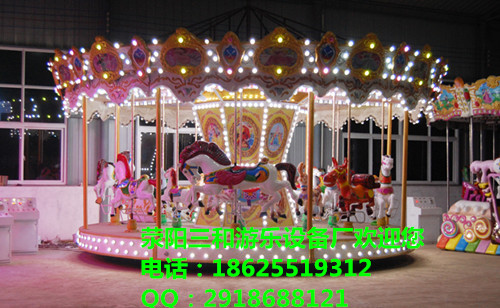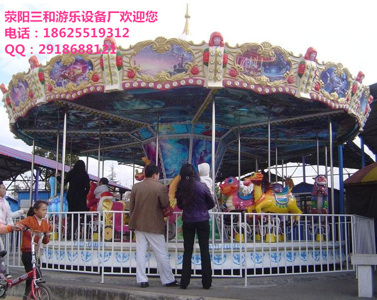 “豪華轉馬”顧名思義就是豪華的旋轉木馬,它是一種垂直軸類單轉體起伏型游藝機,是模擬跑馬廳的娛樂活動而設計的,該游藝機的上部設有彩色的錐形頂棚,頂棚的周圈裝有五彩繽紛的玻璃鋼裝飾板,更顯豪華氣派,儼如華麗的跑馬廳。廳中央有起伏奔跑的大小馬群,設備啟動后,馬群、馬車競相賽跑,形成一個萬馬奔騰的場面,乘客如同參加一場跑馬比賽,無不感到心曠神怡,樂趣無窮! 家長可以帶著孩子們,小情侶們也可以一塊乘坐來促進彼此之間的感情。