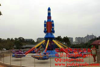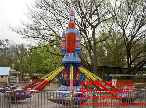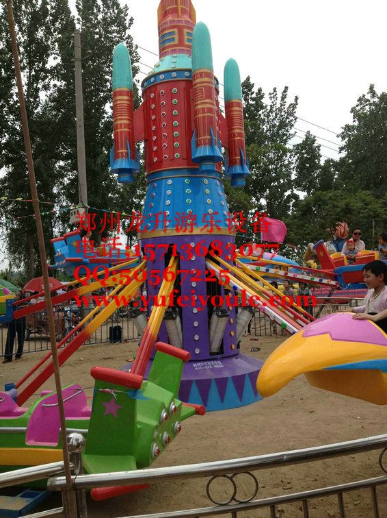 型的裝飾旋轉(zhuǎn),并自由控制上升,游客在飛行中緊握操縱桿隨意升降,互相追逐、射擊,是一種游客可以自己控制升降的游樂設施。 自控飛機有6臂、8臂、12臂等型號,