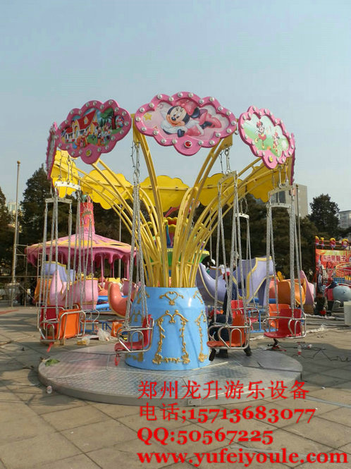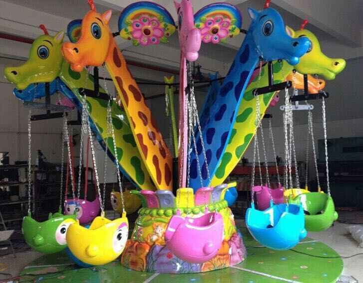 新款小飛椅是搖頭飛椅的縮小版,同樣也是對(duì)之前迷你小飛椅的造型升級(jí),草綠色的底盤加上栩栩如生的蝴蝶、小鳥(niǎo)圖案做點(diǎn)綴,承載座艙的大臂換成了一個(gè)個(gè)形態(tài)逼真、絢麗多彩的長(zhǎng)頸鹿造型,精美絢麗的卡通座艙在空中波浪起伏地旋轉(zhuǎn)飛舞。游客猶如在草原上飛翔。該設(shè)備柔和了絢麗的燈飾和七彩繽紛的圖案設(shè)計(jì),造型華麗,使游客留戀忘返,激發(fā)游客的參與感,本設(shè)備老少皆宜,特別對(duì)少年兒童更具有強(qiáng)烈的吸引力。