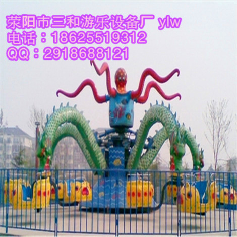 大章魚屬臂類兒童游樂設(shè)備,外觀可愛,造型生動有趣,在各大中小型游樂場所較為常見。設(shè)備開始自行繞中間的回轉(zhuǎn)軸轉(zhuǎn)動,同時各座艙也同時水平旋轉(zhuǎn),大章魚的旋臂隨著中回轉(zhuǎn)軸的轉(zhuǎn)動而上下浮動,如龐大的章魚在舞動自己的爪子。氣勢磅礴,非常壯觀。小朋友做在其中覺得極為刺激驚險,所以一直深受小朋友的歡迎。
