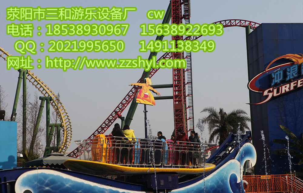 “沖浪者”又叫沖浪滑板,它的亮點就是乘客都是站著乘坐的,前面有欄桿,后面有靠背,必要時可以扣緊安 全帶,是非常好玩的游樂設(shè)備。它運行起來除了順著軌道來回滑行,座艙也會進行360度旋轉(zhuǎn),由于它的座艙是滑板樣式的,因此它的兩端非常刺激,就像是在沖浪一樣涼爽。