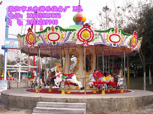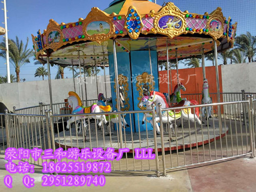 “豪華轉(zhuǎn)馬”顧名思義就是豪華的旋轉(zhuǎn)木馬,它是一種垂直軸類單轉(zhuǎn)體起伏型游藝機,是模擬跑馬廳的娛樂活動而設(shè)計的,該游藝機的上部設(shè)有彩色的錐形頂棚,頂棚的周圈裝有五彩繽紛的玻璃鋼裝飾板,更顯豪華氣派,儼如華麗的跑馬廳。廳中央有起伏奔跑的大小馬群,設(shè)備啟動后,馬群、馬車競相賽跑,形成一個萬馬奔騰的場面,乘客如同參加一場跑馬比賽,無不感到心曠神怡,樂趣無窮! 家長可以帶著孩子們,小情侶們也可以一塊乘坐來促進彼此之間的感情。