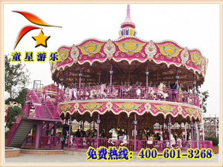 設(shè)備啟動后,金光銀光,閃閃相映,馬群、馬車競相賽跑,是一種垂直軸類單轉(zhuǎn)體起伏型游藝機(jī),是模擬馬廳的娛樂活動而設(shè)計的,該游藝機(jī)的上部設(shè)有彩色的錐形頂棚。豪華轉(zhuǎn)馬游樂設(shè)備設(shè)計簡單,價格低廉,帶有音樂,屬于非刺激性游樂設(shè)備,美麗的外觀以及美妙的音樂是吸引人的一部分。