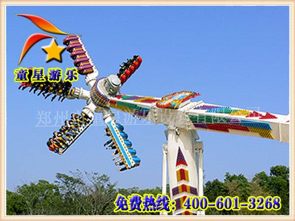 極速風(fēng)車是新創(chuàng)意及用高科技打造的大型游樂設(shè)施,在天空中就象一把伸展的大風(fēng)車,游客坐在“風(fēng)車葉片”上,立柱緩緩?fù)衅,然后大臂正反公轉(zhuǎn),座艙托臂急速正反自轉(zhuǎn),在離心力作用下座艙自旋,三種運動的疊加結(jié)合,風(fēng)車可在18米高空360度優(yōu)美自由翻滾。