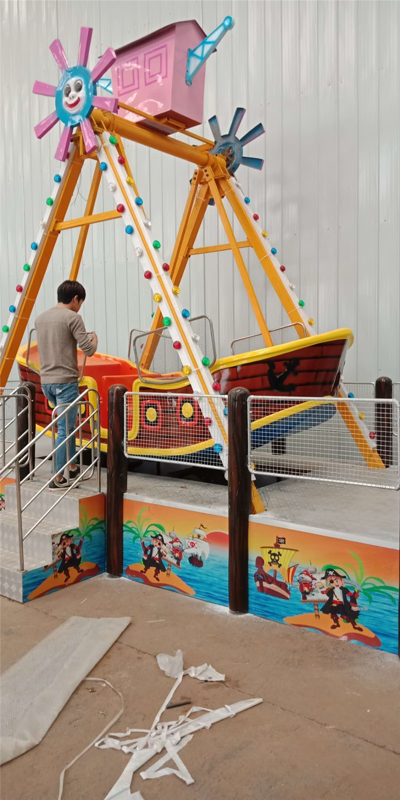 海盜船是一種全新設(shè)計的觀覽車類游藝機,是一種繞水平軸往復(fù)擺動的游樂項目,該種游藝機因造型圖同而名稱各異,“海盜船”因為其外形仿古代海盜船而得名。海盜船造型為各異,海盜船啟動后從緩慢擺動慢慢的急速擺動,乘客乘坐于海盜船之上,隨著由緩至急的往復(fù)擺動,猶如蒞臨驚濤駭浪的大海之中,時而沖上浪峰,時而跌入谷底,驚險刺激,挑戰(zhàn)乘客心理承受能力的極限,我公司生產(chǎn)的海盜船可配套四聲道汽車音響系統(tǒng),給用戶帶來耳目一新的感覺。