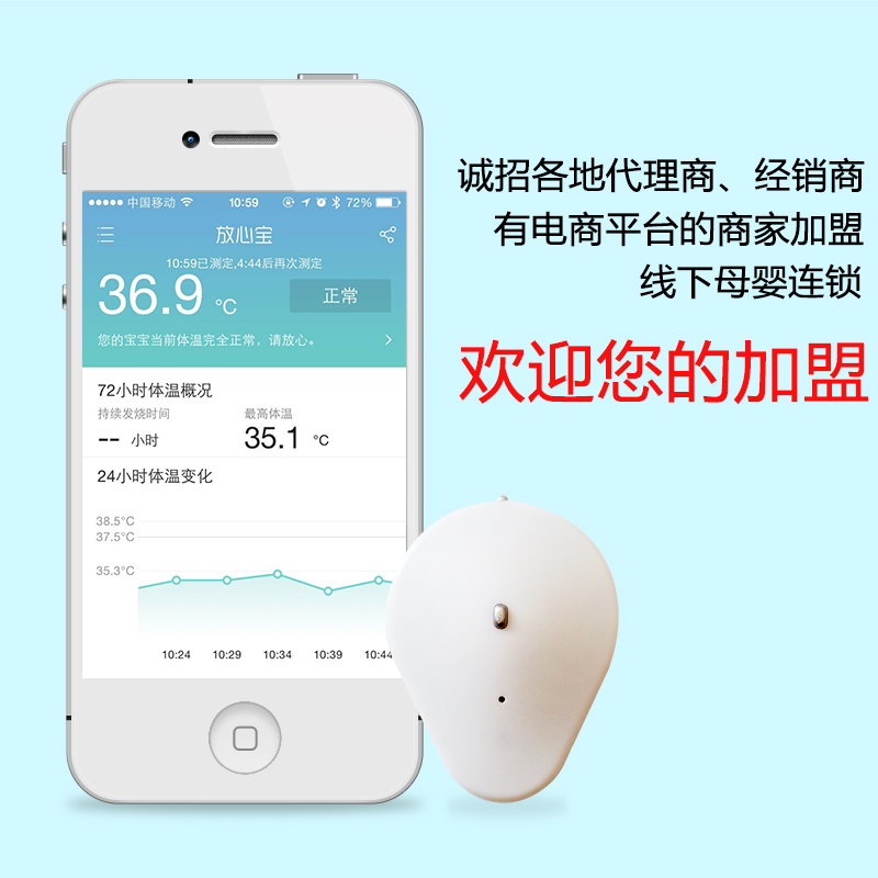 2014年度最新可穿戴專利產(chǎn)品,輕松科學(xué)及時照顧生病寶寶,測量體溫方式的革命性改變,通過藍(lán)牙與手機(jī)對接,體溫異常手機(jī)自動報警,24小時不間斷的檢測并記錄體溫變化