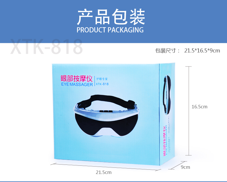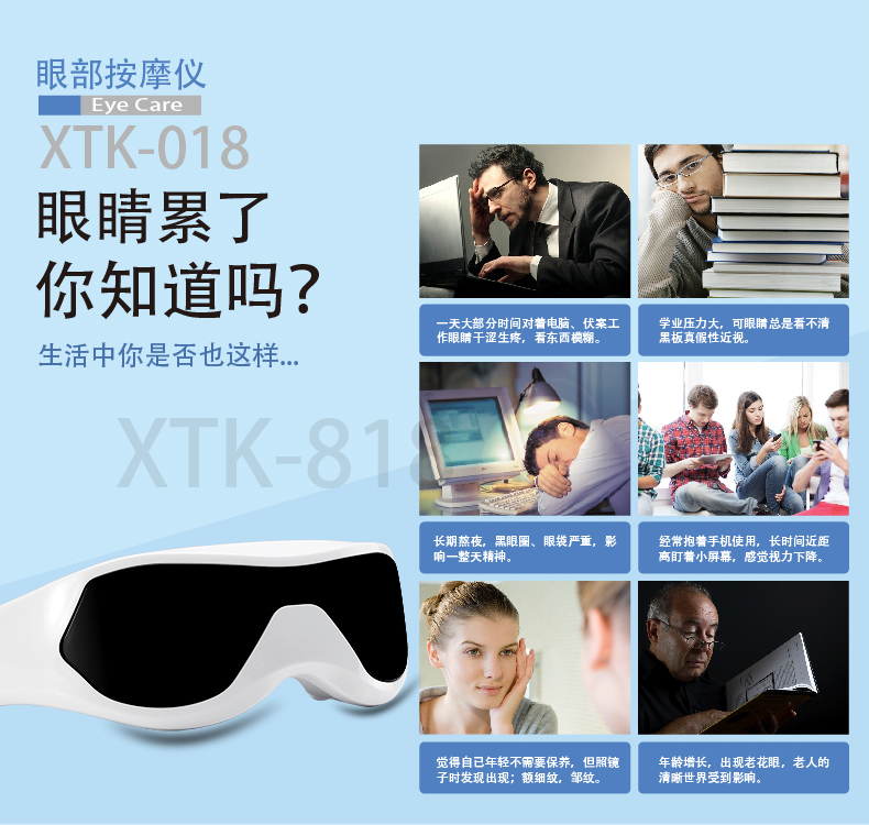 本產(chǎn)品由二十二顆釹磁石組成微循環(huán)磁場(chǎng),產(chǎn)生標(biāo)準(zhǔn)磁通量為600-800gs,能深入皮下3mm,n.s極交錯(cuò)排列,形成循環(huán)磁場(chǎng),能有效地消除眼睛疲勞,促進(jìn)血液循環(huán),可充分松弛大腦神經(jīng),對(duì)睡眠不良者及失眠癥有很好的療效;能有效改善眼部及腦部微循環(huán),可消除眼角皺紋,黑眼圈,保護(hù)視力,提高記憶力。適用于家庭每位成員。每天使用眼護(hù)士按摩儀可有效預(yù)防,眼睛近視,清除眼袋,皺紋,黑眼圈,增強(qiáng)皮膚彈性;產(chǎn)品采用眼鏡式造型,佩戴舒適,按摩力度有九種方式可以調(diào)節(jié),還有自動(dòng)定時(shí)控制,九種循環(huán)指壓按摩方式可使眼球與眼肌充分放松,降低眼內(nèi)壓,消除用眼過(guò)度引起的酸 脹,腫痛,干澀,怕光及視物模糊等癥狀;電腦ic程序控制,給您的生活增添無(wú)限歡樂(lè),科技,健康舒適,是您身邊的健康衛(wèi)士。外觀精美顏色靚麗,是絕佳的眼部保健小護(hù)士,也是贈(zèng)好友的絕佳的禮品、贈(zèng)品.